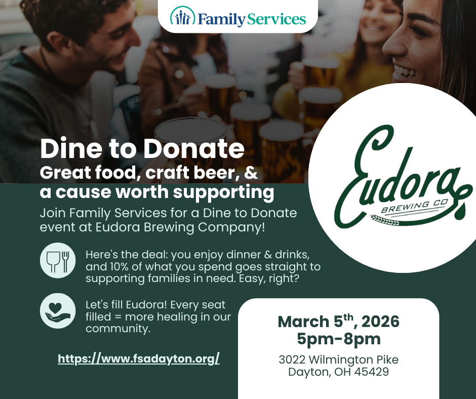 What's a Dine to Donate? It's simple: you enjoy great food and drinks, and a percentage of your bill goes directly to Family Services at no extra cost to you! Just show up, order your favorites, and help support trauma-informed counseling, prevention education, and services for survivors in our community.